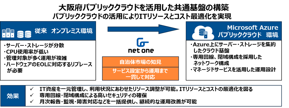ネットワンシステムズ株式会社(本社:東京都千代田区、代表取締役 社長執行役員:竹下 隆史)は、大阪府(大阪府知事:吉村 洋文)の行政事務を支える各種業務システム群が稼働する共通基盤環境をパブリッククラウドであるMicrosoft Azure上に構築しました。本環境は、日本マイクロソフト株式会社(本社:東京都港区)との協働体制のもと、IT資産の一元管理による運用の効率化、行政を支える高いセキュリティの確保、マネージドサービスによる運用サポートと継続的な最適化を実現し、2026年4月より本格稼働を開始しています。