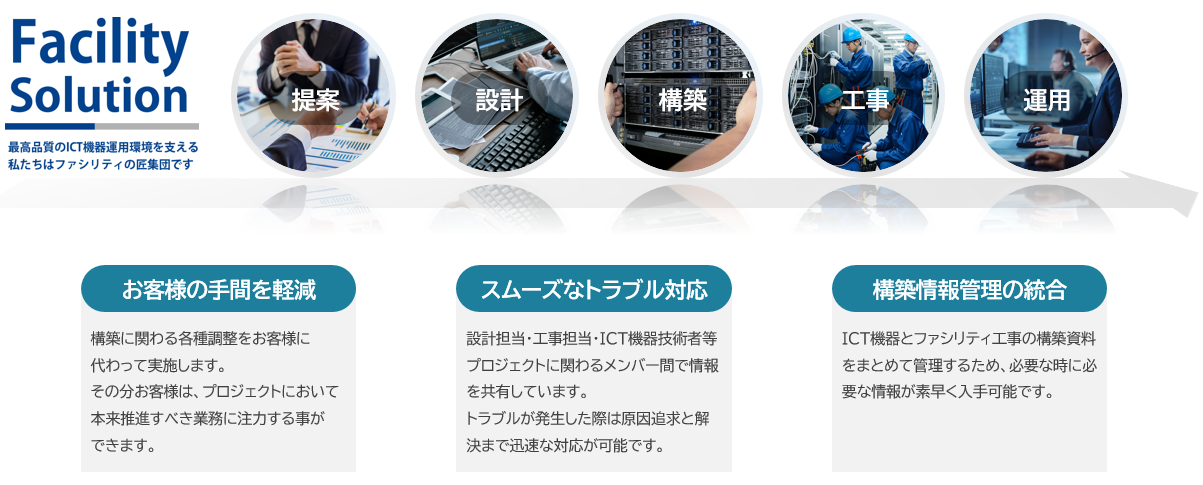 ICT機器設計からファシリティ構築・運用まで “ワンストップ” でサポートします。