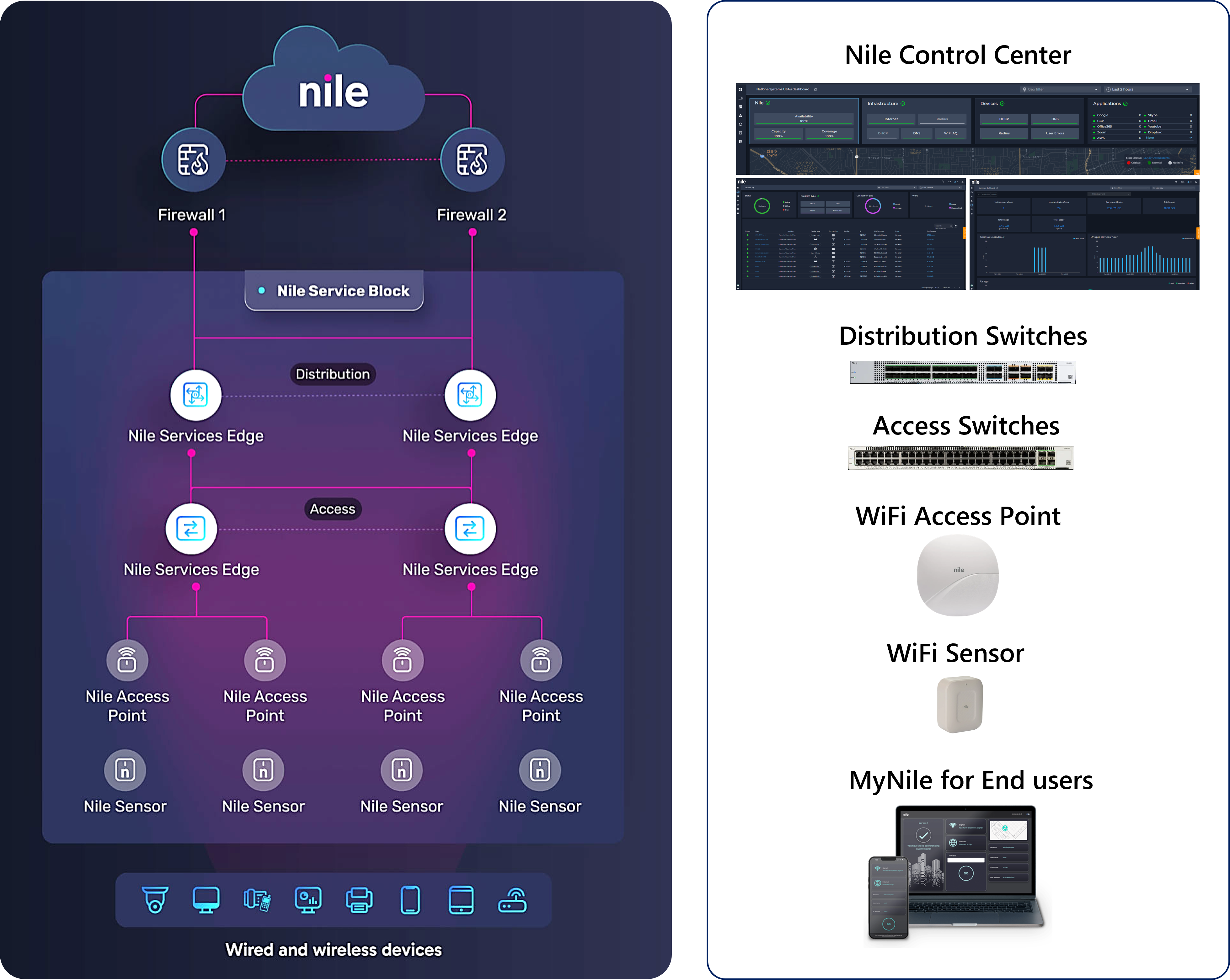 Nile Access Service(コアサービス) 専用設計された有線・無線ネットワークハードウェアと自律運用ソフトウェアをパッケージ提供。設計、導入、保守、パフォーマンス保証をワンサービスで実現します。 |