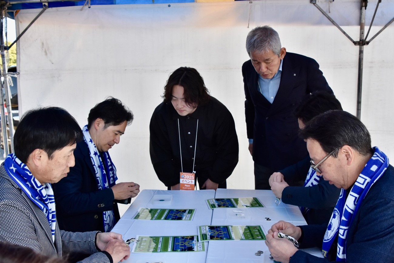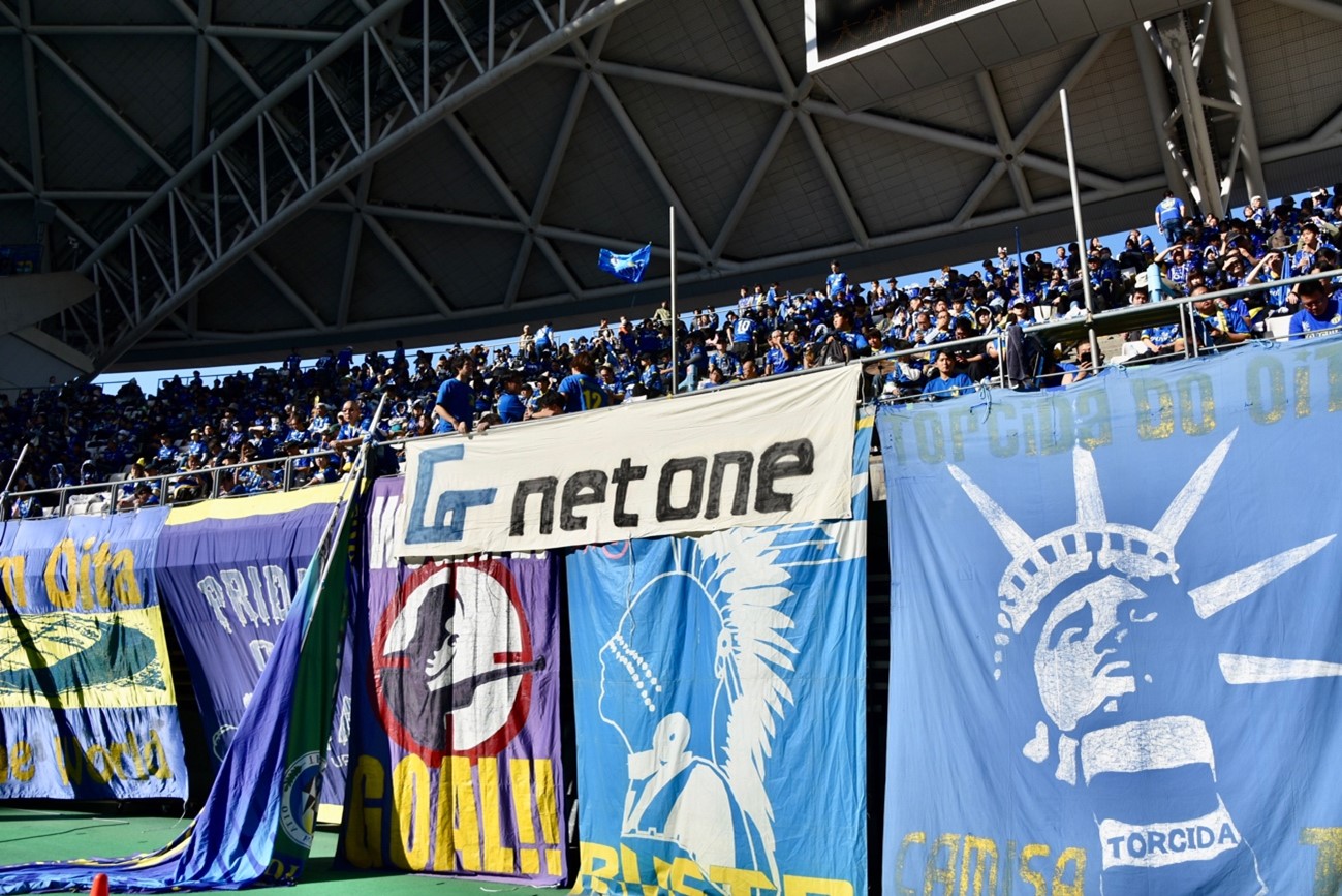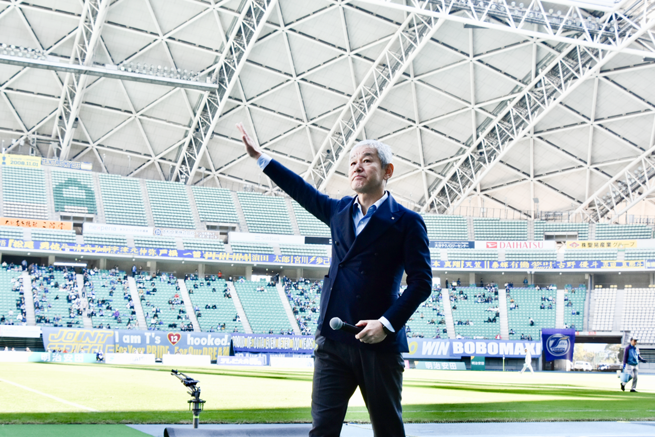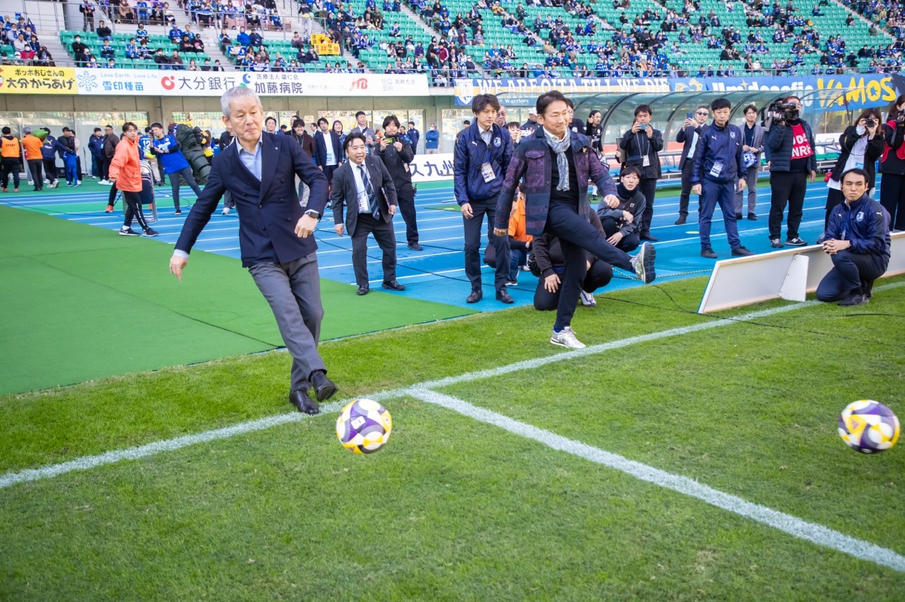 キックオフ前には、竹下隆史代表取締役社長からサポーターへ向けての挨拶。そして、竹下社長とネットワンパートナーズ株式会社田中拓也社長がキックインセレモニーを行いました。竹下社長は、千葉から1,000人以上駆けつけたジェフサポーターへ、そしてJ2残留を決める大事な一戦を迎えたトリニーターサポーターへ熱いメッセージが送られました。また大分市佐賀関の大規模火災についても触れ、会場からは多くの拍手とネットワンコールが響きました。