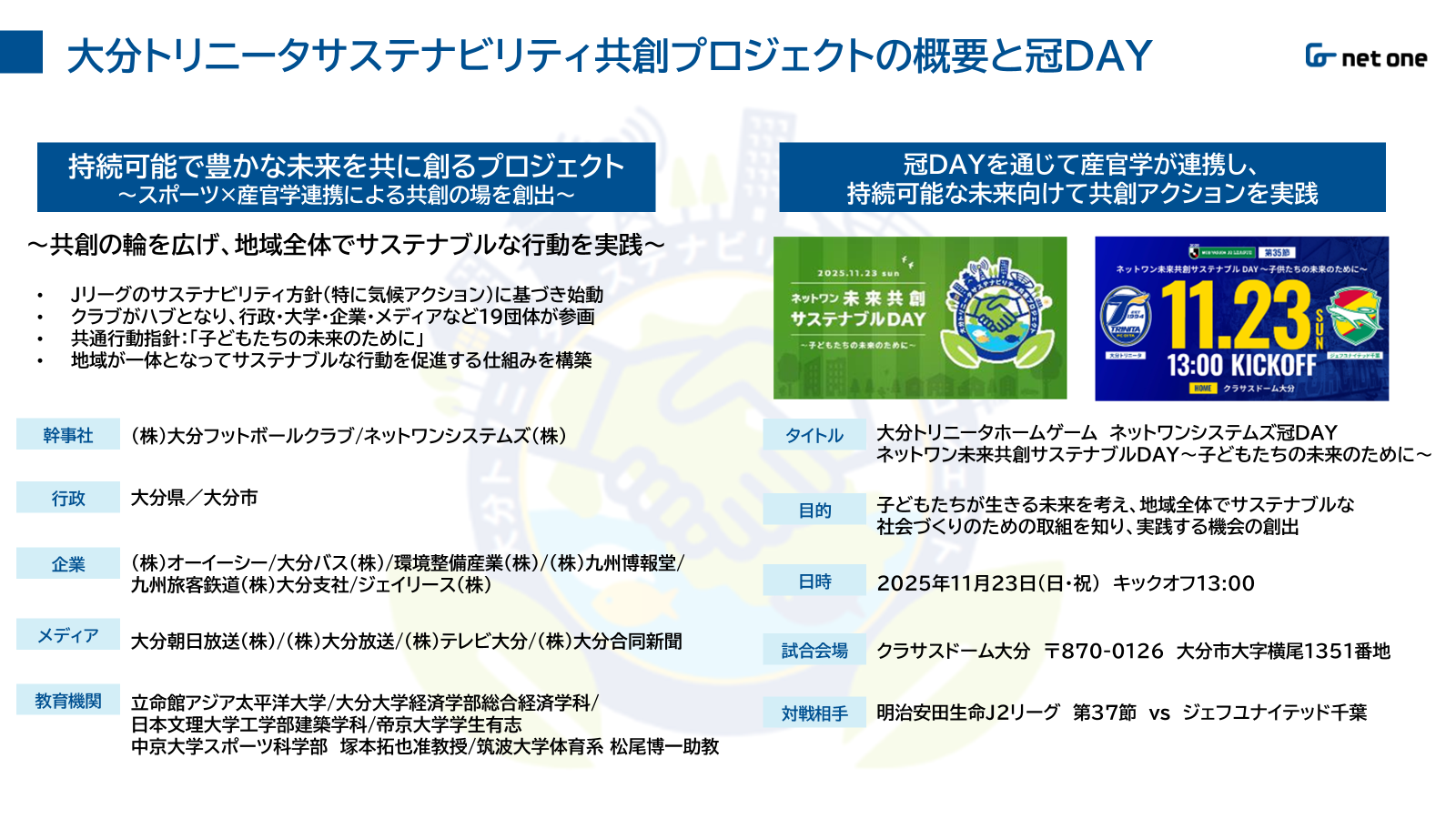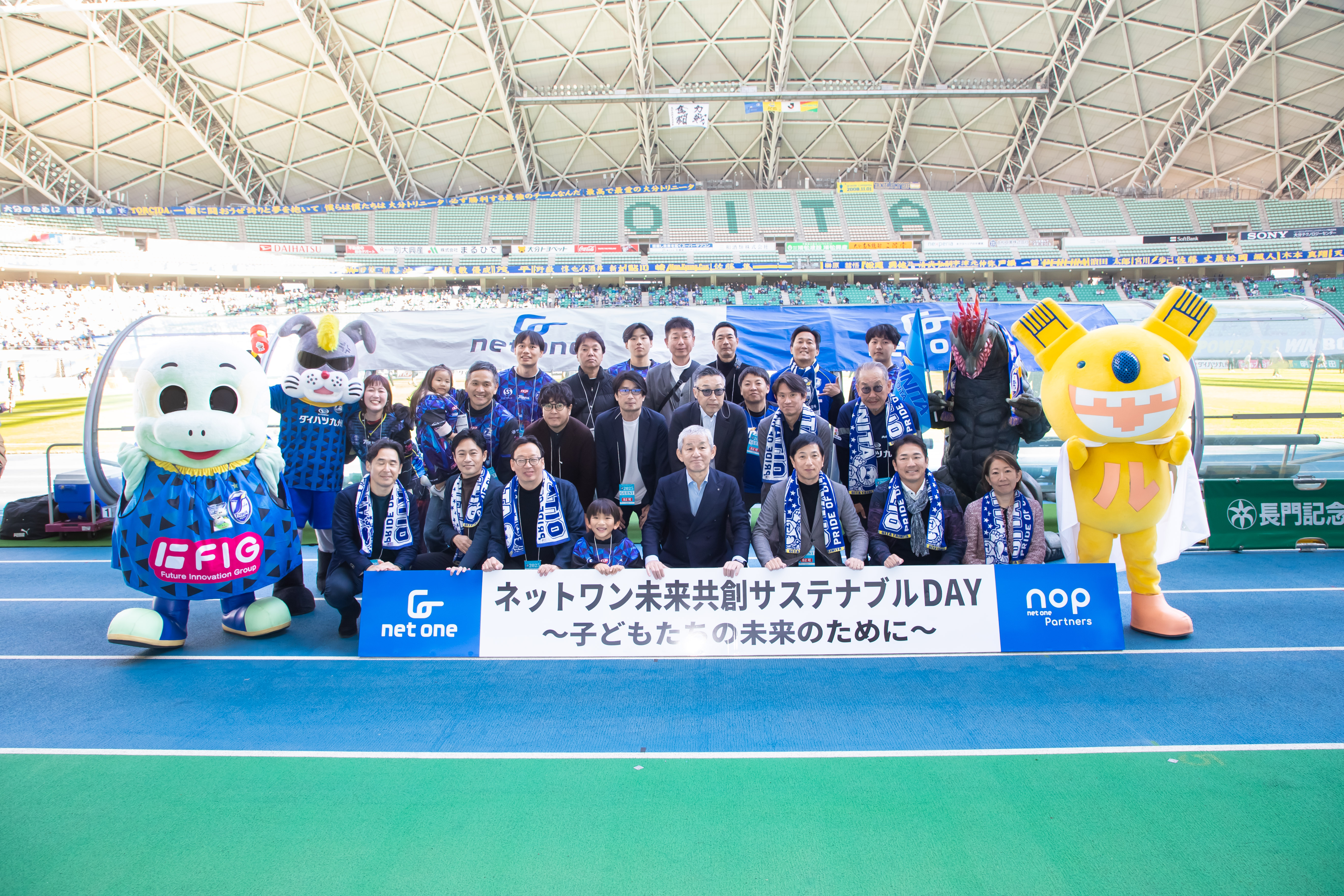 ネットワンシステムズは大分トリニータホーム最終戦(11/23)で、「未来共創サステナブルDAY〜子どもたちの未来のために〜」を開催しました。ネットワングループは、2009年から大分トリニータのオフィシャルスポンサーとして、2020年からアカデミーユニフォームスポンサー、ソーシャルアクションパートナーとしてスポーツを通じた社会貢献に取り組み、今年で17年目になります。