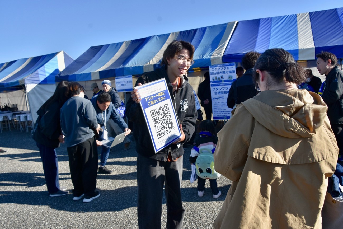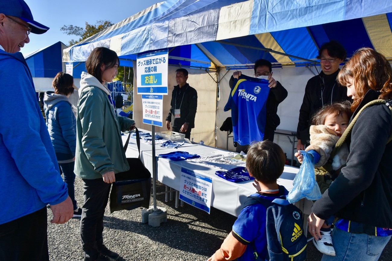 昨年も実施されたこのプロジェクトは、使わなくなった応援グッズを新規のサポーターへ継承することでリユースを促進する取り組み。ブースには、タオルマフラーやTシャツなど多くの衣類が寄せられました!寄付されてから新規の方へ渡るスピードも早く、手にした人は早速身に付けながら、みんな笑顔でスタジアムへ向かいました。