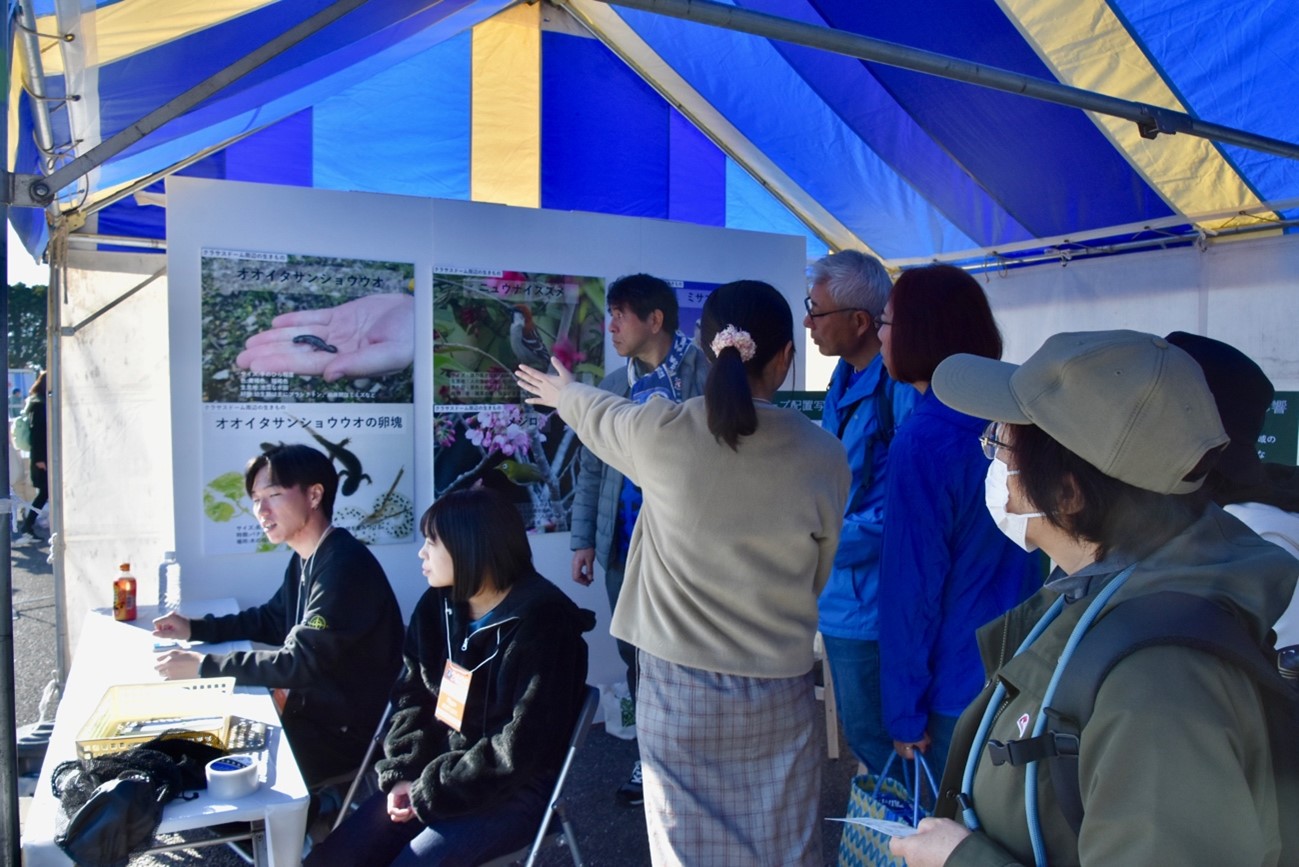 日本文理大学では、日頃から⽣物多様性の維持に関する取り組みを行っています。大分スポーツ公園のビオトープ保全活動は主に、大分県土木建築部の職員と日本文理大学の学生ボランティアが担っており、この日はスタジアム周辺の⼤分スポーツ公園の里山維持工法の紹介や、⾃然・⽣態系の仕組みをパネルで紹介しました。またスタジアム周辺に暮らす希少種の、オオイタサンショウウオの⽣態を学べるゲームも⾏いました。