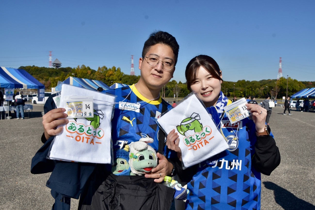 九州旅客鉃道株式会社⼤分⽀社協力のもと行われたのは、JR高城駅からクラサスドームまでの5.5kmを歩いて、CO2削減と健康推進を図るサステナウォーキング。スタジアムの外に出て行うイベントは初めての試みでしたが、40名を超える参加者の方々と楽しんで歩くことができました。大分県の健康アプリ「あるとっく」を利用した方にはタオルマフラーが贈られ、希望者は試合前のウォーミングアップ見学を体験できました。 参加者は「途中でキツイところもありましたが、みんなで楽しく歩くことができました!前を歩く人のリュックには“100kmマラソン”のキーホルダーが付いていて、強者がいるなと見入ってしまいました(笑)。」参加者は12歳から86歳まで(!)年齢を超えたチームワークで全員完歩できました!