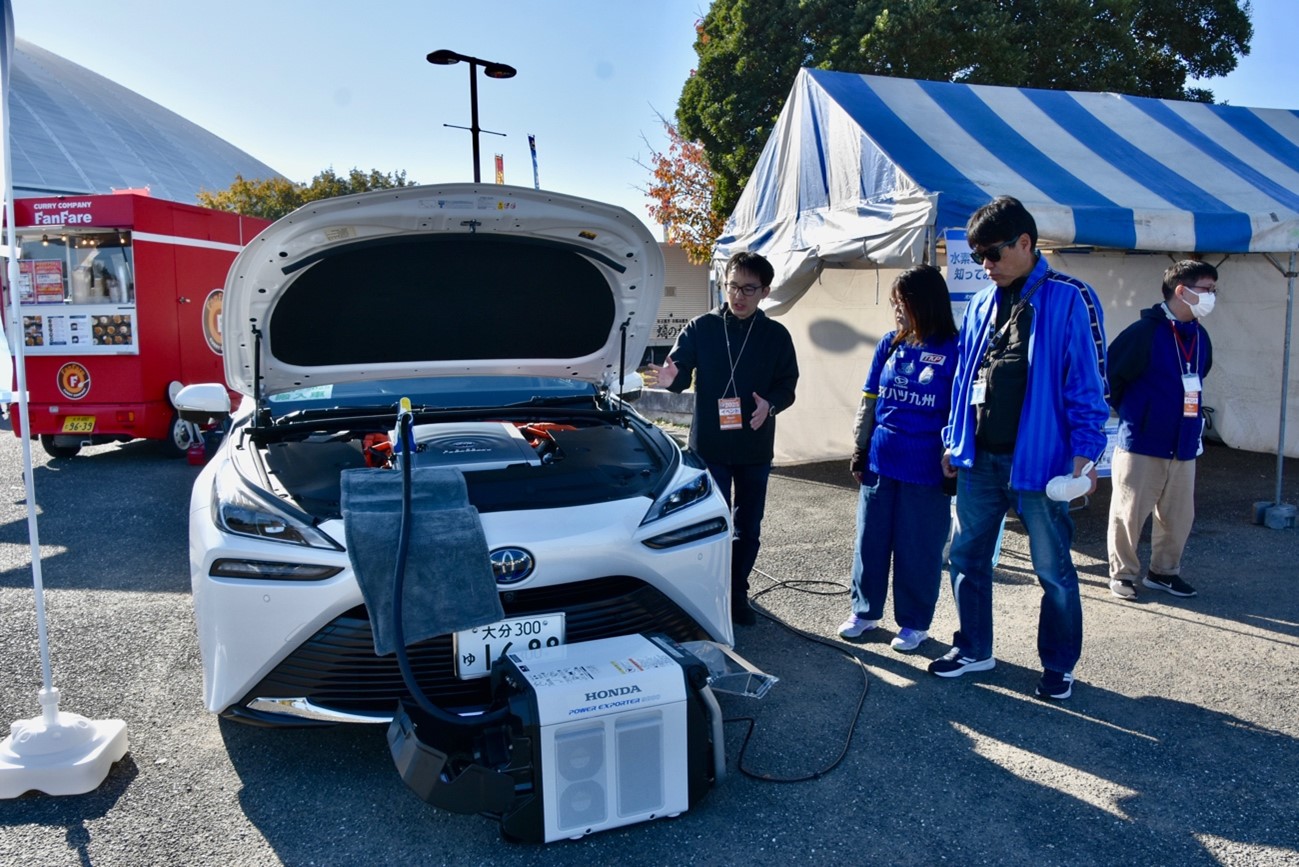 市民、事業者、行政すべての主体が、温室効果ガスの削減や水素の活用に積極的に取り組むことで、最終的に脱炭素(カーボンニュートラル)を実現し、子どもたちに美しい大分を残すため様々な取り組みを推進する大分市環境対策課。ブースには水素を燃料として動くトヨタの「MIRAI」を展示。燃料電池⾃動⾞から外部給電機を使って電気を取り出し、ドローンサッカー®の充電⽤電⼒として実際に活⽤することなど、訪れたサポーターも興味深く耳を傾けました。