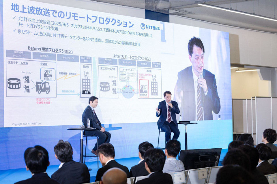 NTTが提唱する次世代の情報通信基盤「IOWN APN」は、低消費電力、大容量、そして極限までの低遅延を実現する技術です。具体的な使用事例として、離れた拠点をリアルタイムで結ぶバーチャルプロダクションや、放送局から遠隔でスポーツ中継を行うリモートプロダクションなどが小山氏から紹介されました。